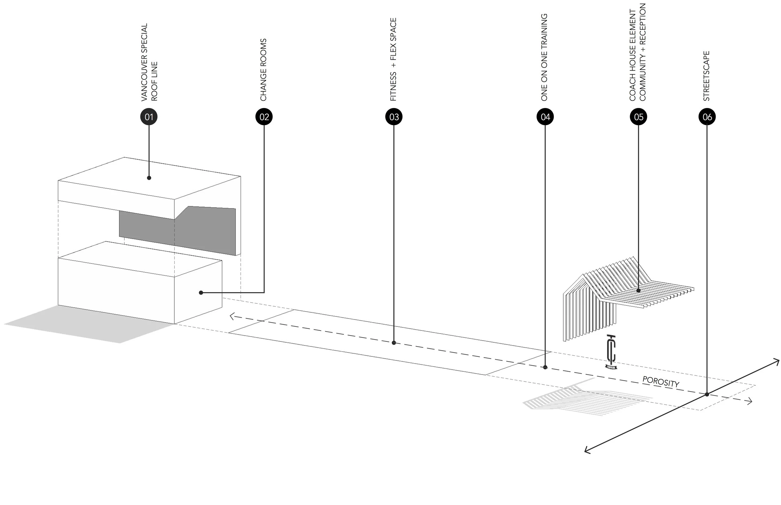 From the coach house to the field house, this project is a about the evolution and transformation of an idea. An idea that is guided by the potential for fitness to be liberating, social and connected. When Keighty Gallagher gave us the opportunity to help her evolve and transform from the coach house to the field house, we were excited by the potential. The result, a space that is determined in its planning, flexible in its use and open in its application. The change room is an open uni-sex area and subtly housed in an open roofline concept resembling the local architectural vernacular of a Vancouver Special. The fitness + flex space is designed to be programmed and reprogrammed, complete flexibility including the capacity to host special events. At the front, a nod to the coach house where Keighty had her humble beginnings. A series of extruded eave lines form a translucent partition for the reception area and from the adjacent community area the extrusions take on a more solid form creating a sense of enclosure and intimacy. It was also important for the design to allow for transparency through to the streetscape, we felt this was part of the program. Each design component woven together through a sense of porosity - liberating, social and connected.